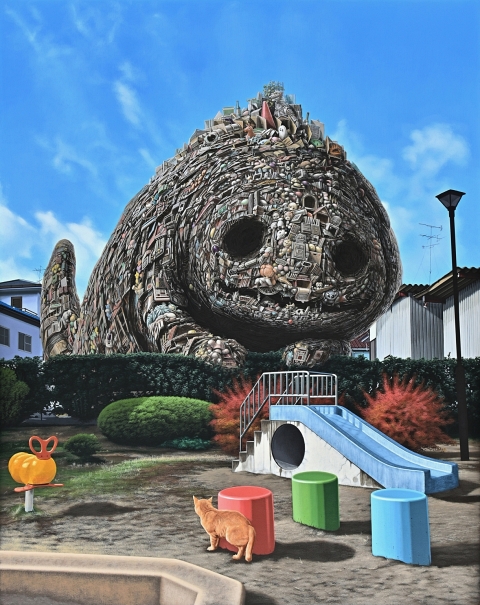 木製パネルに綿布・アクリル絵の具