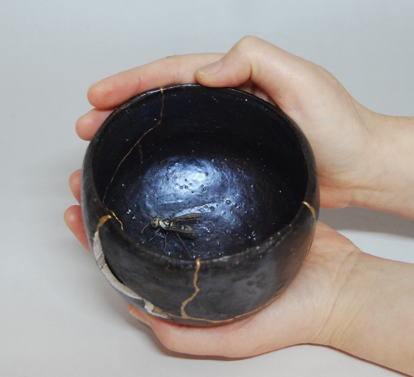 チャワンムシ-針- 2023H8.5 x W12.2 x D12.2 cm陶(茶碗ー黒楽・ハチー磁器、ラスター)、樹脂(継ぎ部分)、ステンレ�(c) 2009 COMBINE ◀︎ All Works ▶︎ ◀︎ ▶︎ ◀︎ All Works ▶︎