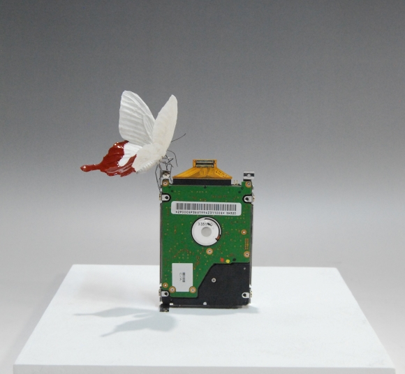 ハードディスクに蝶 -赤- 2021H40.6 x W26.1 x D26 cm陶(磁器土・備前土・上絵・ラスター彩)、ハードディスク(c) 2009 COMBINE ◀︎ All Works ▶︎ ◀︎ ▶︎ ◀︎ All Works ▶︎