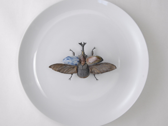 皿にカブトムシ染付青海波