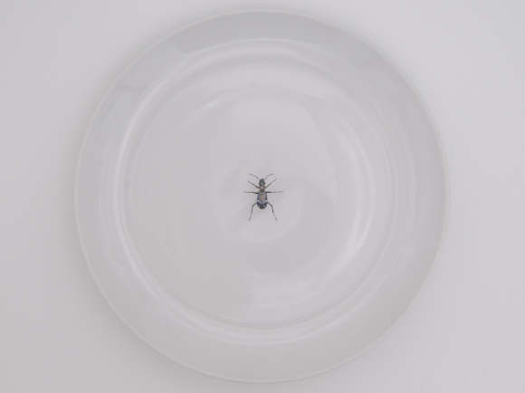 皿にハンミョウ 2022H3.5 x W3 x D1.3 cm陶(磁器土<ラスター彩・金彩>・備前土)、白磁皿(レディメイド)(c) 2009 COMBINE ◀︎ All Works ▶︎ ◀︎ ▶︎ ◀︎ All Works ▶︎