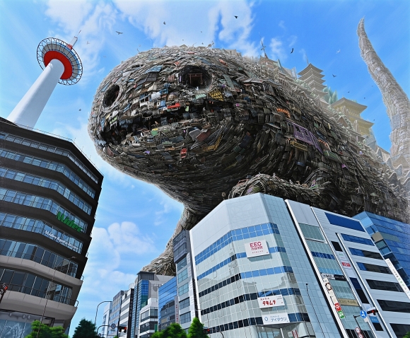 かいじゅう襲来 2024H130.3 x W162 cm100 F木製パネルに綿布・アクリル絵の具(c) 2009 COMBINE ◀︎ All Works ▶︎ ◀︎ ▶︎ ◀︎ All Works ▶︎
