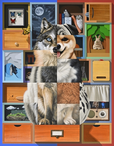 オオカミと犬のキャビネット 2025H116.7 x W91 cm50 F木製パネルに綿布・アクリル絵の具(c) 2009 COMBINE ◀︎ All Works ▶︎ ◀︎ ▶︎ ◀︎ All Works ▶︎