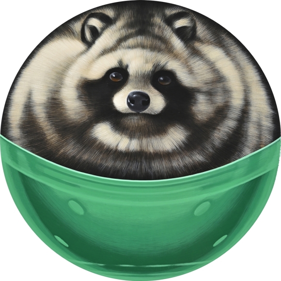 カプセルラクーンドッグ 2023H33.3 x W33.3 cm木製パネルに綿布・アクリル絵の具(c) 2009 COMBINE ◀︎ All Works ▶︎ ◀︎ ▶︎ ◀︎ All Works ▶︎