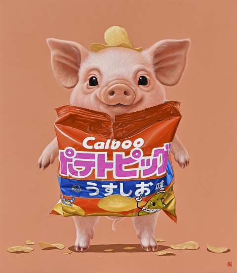 カルブーポテトピッグス 2025H53 x W45.5 cm10 F木製パネルに綿布・アクリル絵の具(c) 2009 COMBINE ◀︎ All Works ▶︎ ◀︎ ▶︎ ◀︎ All Works ▶︎