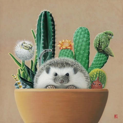 サボテンハリネズミ 2024H27.3 x W27.3 cm3 S木製パネルに綿布・アクリル絵の具(c) 2009 COMBINE ◀︎ All Works ▶︎ ◀︎ ▶︎ ◀︎ All Works ▶︎
