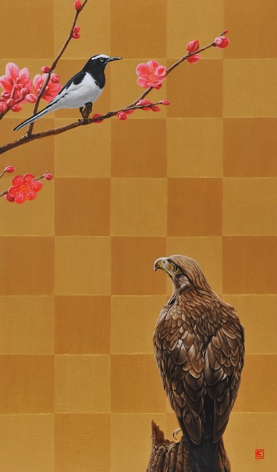 木製パネルに綿布・アクリル絵の具