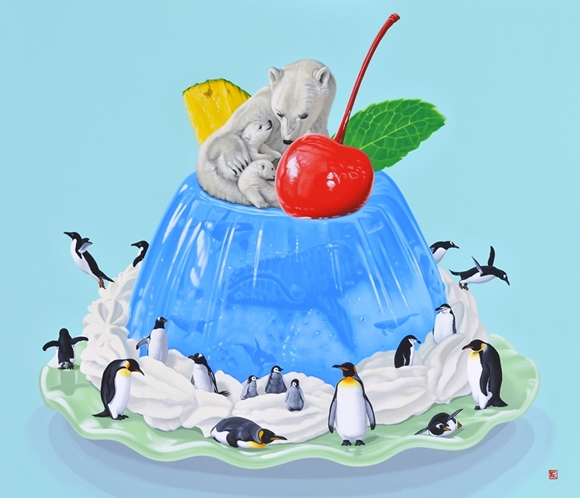 ゼリーアラモード 2019H45.5 x W53 cm10 F木製パネルに綿布・アクリル絵の具(c) 2009 COMBINE ◀︎ All Works ▶︎ ◀︎ ▶︎ ◀︎ All Works ▶︎
