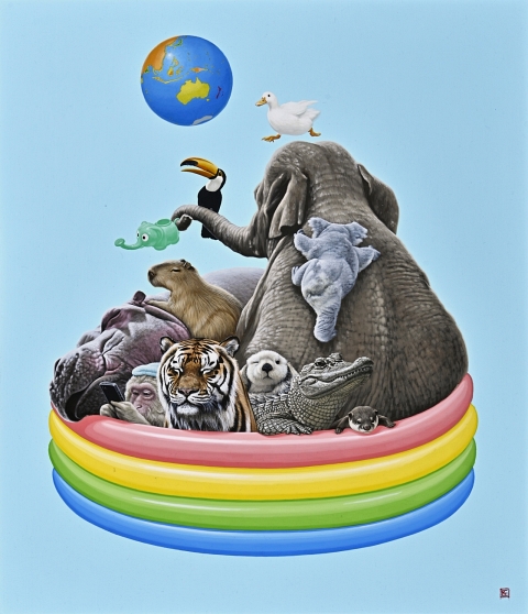 木製パネルに綿布・アクリル絵の具