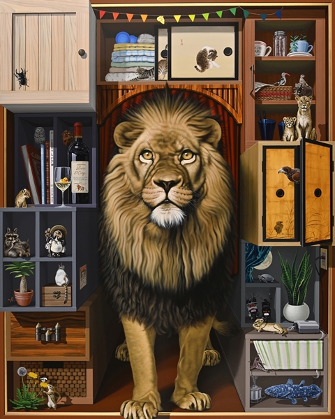 ライオンの棚 2019H162 x W130.3 cm100 F木製パネルに綿布・アクリル絵の具(c) 2009 COMBINE ◀︎ All Works ▶︎ ◀︎ ▶︎ ◀︎ All Works ▶︎