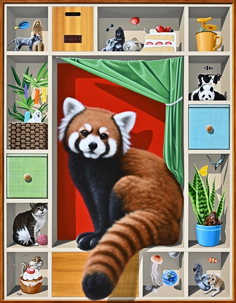 レッサーパンダのキャビネット 2021H116 x W91 cm50 F木製パネルに綿布・アクリル絵の具(c) 2009 COMBINE ◀︎ All Works ▶︎ ◀︎ ▶︎ ◀︎ All Works ▶︎