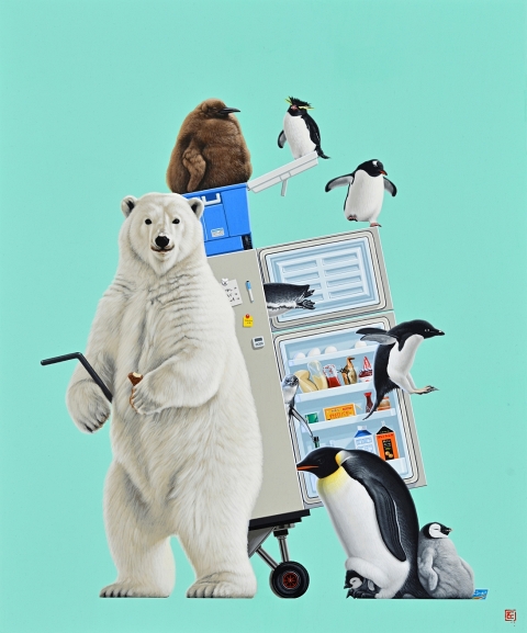 木製パネルに綿布・アクリル絵の具